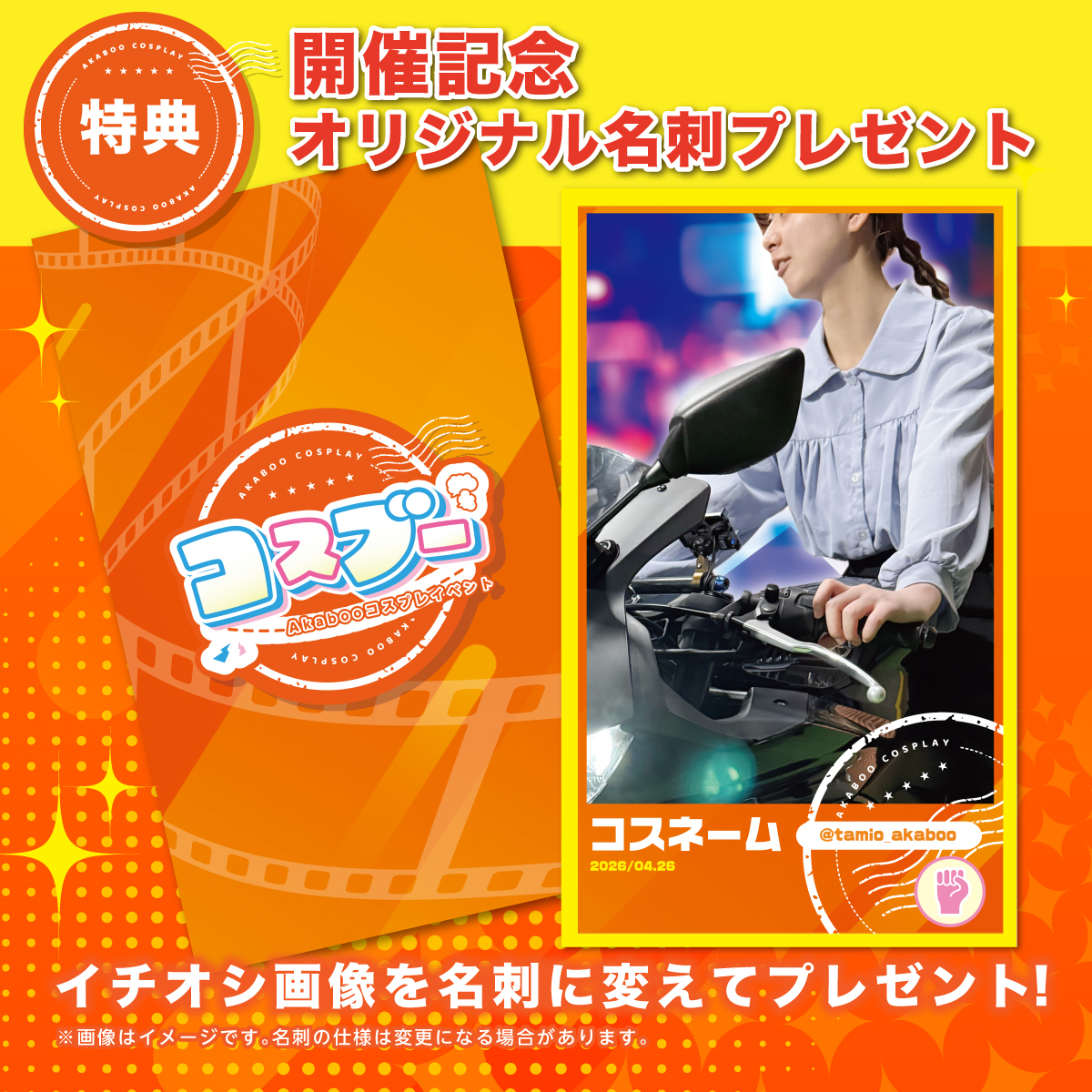 チケット申し込み時に登録するイチ推し画像を利用して、コスブーにてあなたの写真が入った名刺を作成いたします。